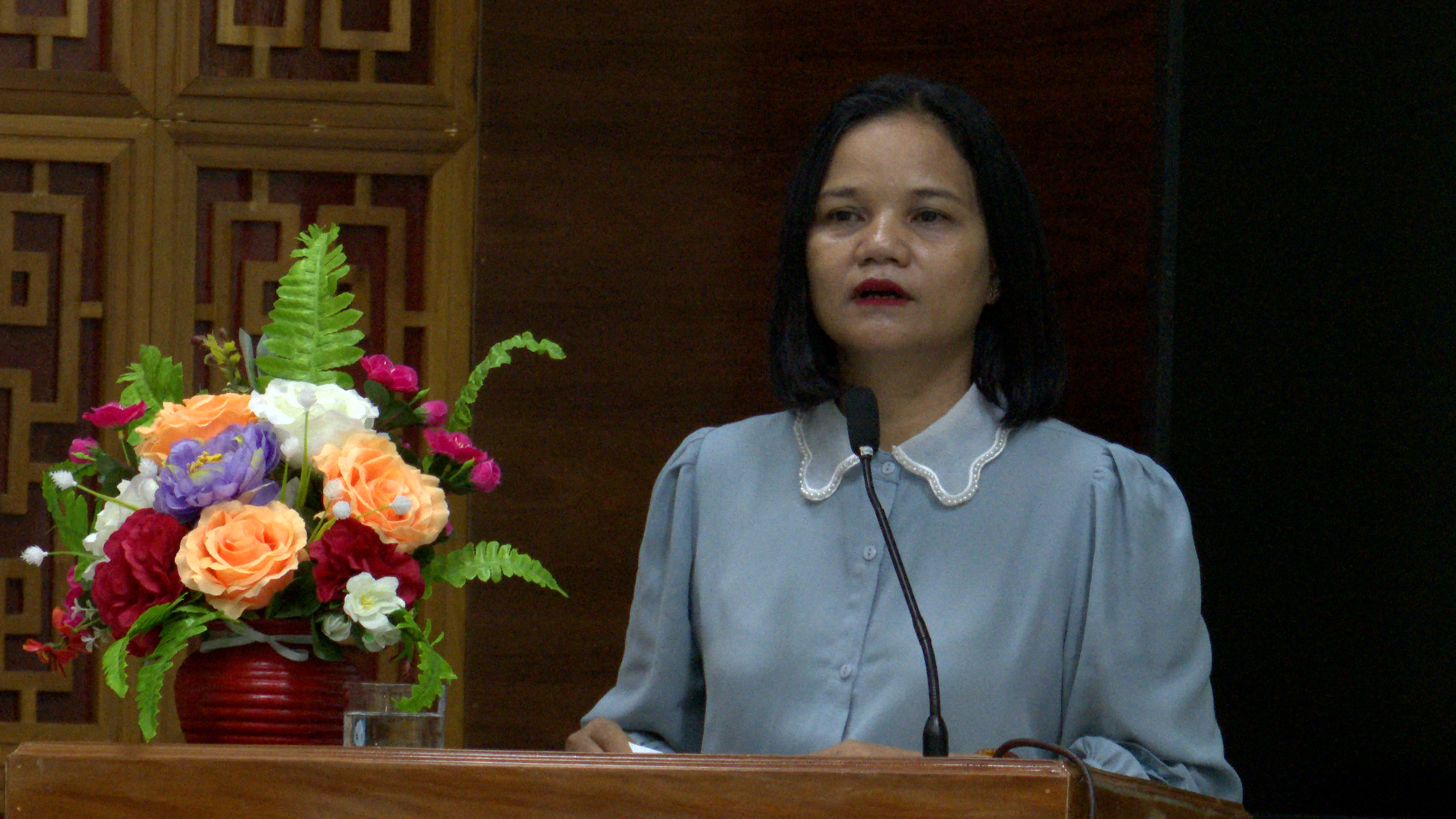 Đồng chí Phùng Thị Thương – Bí thư Đảng ủy, Chủ tịch HĐND trình bày chuyên đề Nghị quyết Đại hội đại biểu Đảng bộ xã Nam Trà My lần thứ I, nhiệm kỳ 2025 – 2030.
