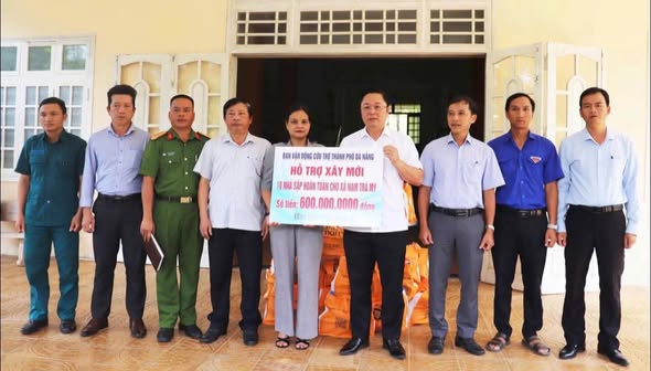 Chủ tịch Ủy ban MTTQ Việt Nam thành phố Lê Trí Thanh (thứ 4, bên phải sang) trao 600 triệu đồng hỗ trợ xây mới cho 10 nhà dân bị thiệt hại hoàn toàn do mưa lũ, sạt lở của xã Nam Trà My. Ảnh: ĐẮC MẠNH