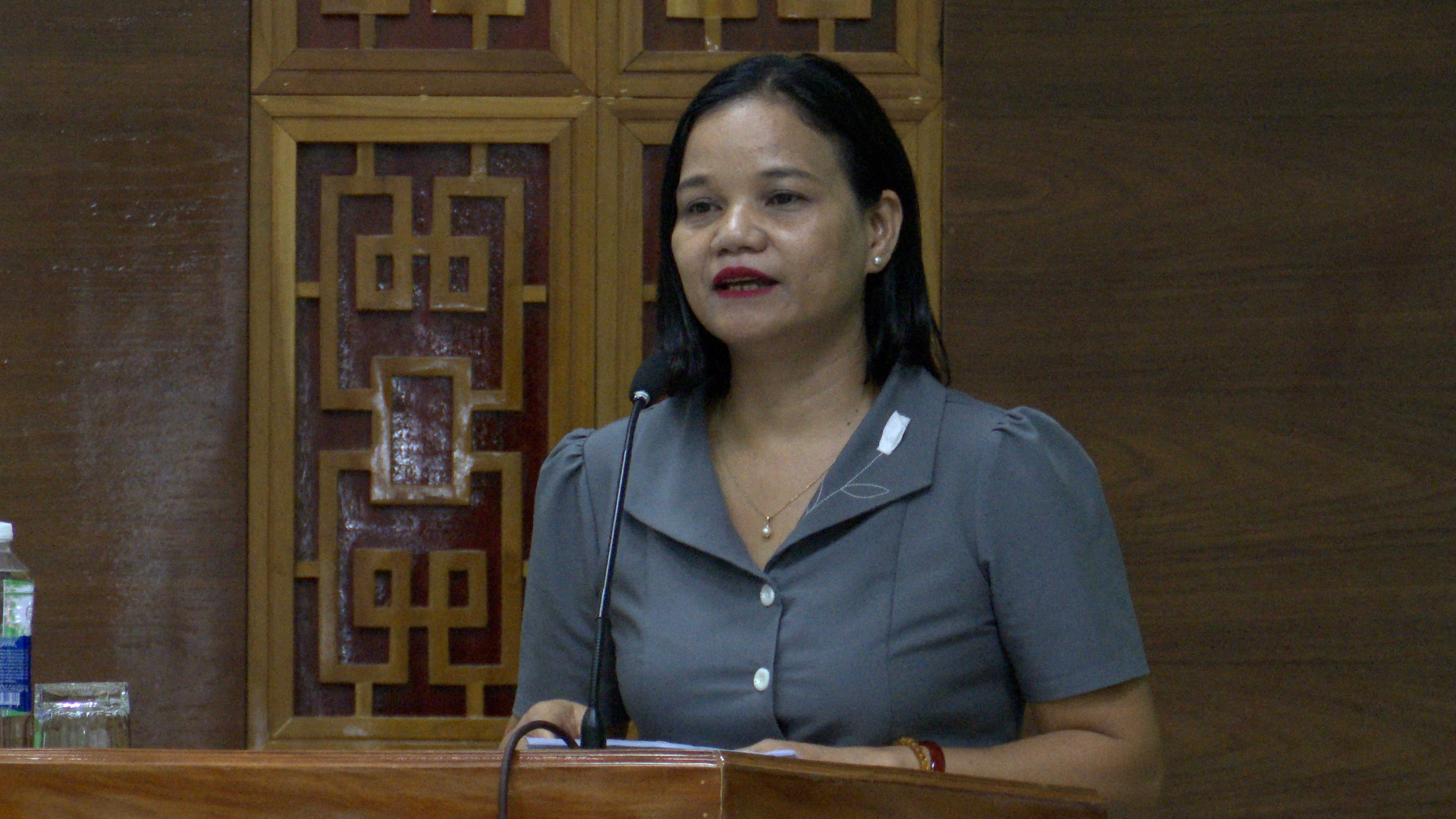Đồng chí Phùng Thị Thương - Bí thư Đảng uỷ xã Nam Trà My báo cáo chuyên đề tại Hội nghị